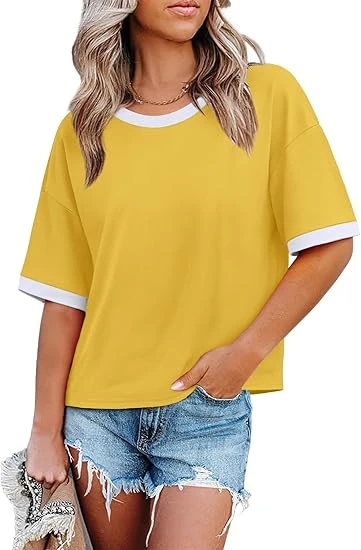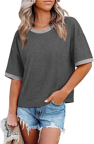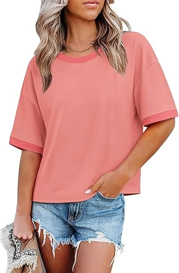 Womens T Shirts Loose Fit Short Half Sleeve Crew Neck Oversized Tshirts Color Block Summer Tops Fashion